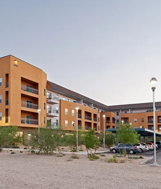 Apache ASL Trails Apartments is the premier community for deaf seniors in the nation. Situated along the light rail line, the 75-unit, tax-credit, transit-oriented housing project creates a barrier-free community for deaf seniors. The development incorporates state-of-the-art technology for its deaf residents and the operating staff all use American Sign Language (ASL). All community spaces and units minimize visual barriers with open floor plans, glass facades and clear sight lines. Wide hallways and automatic entrance doors allow for improved communication and mobility, while specific lighting and paint colors are easier on the eyes. The project also includes a small medical clinic on the southwest corner of the facility, a community room, kitchen, gym and salon.