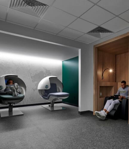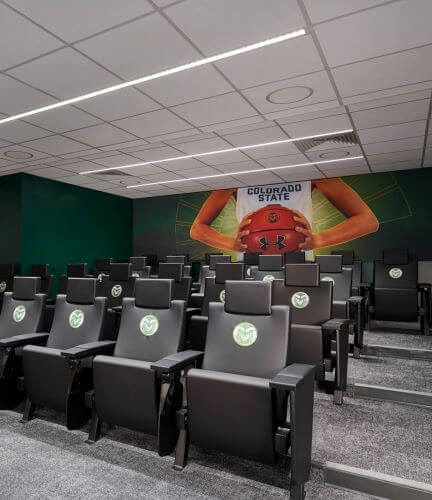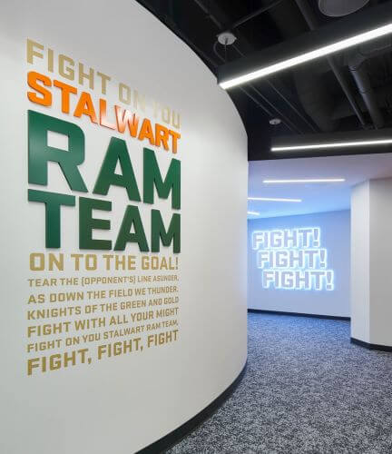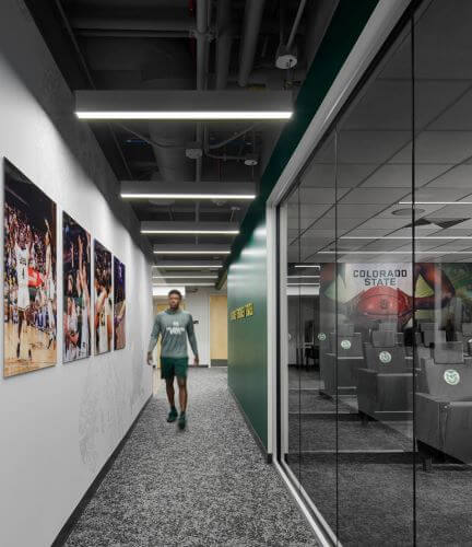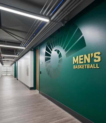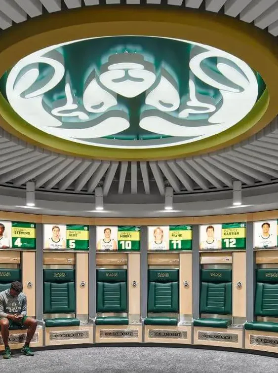 The project included lockers and restroom/showers for approximately 16 student athletes per team, flex space/player lounges for each team, film rooms, a small coaches’ locker room/meeting space, and separate storage for basketball/game-day equipment. The project portrays a deep understanding of peer institution locker room facilities and what today’s student athletes and recruits find most compelling. The design solution respects the history of the CSU Basketball program and the Moby Arena Complex while stewarding the vision for growth and success of future student athletes.