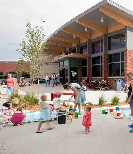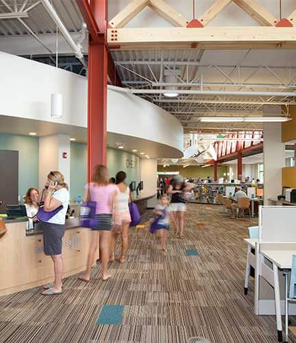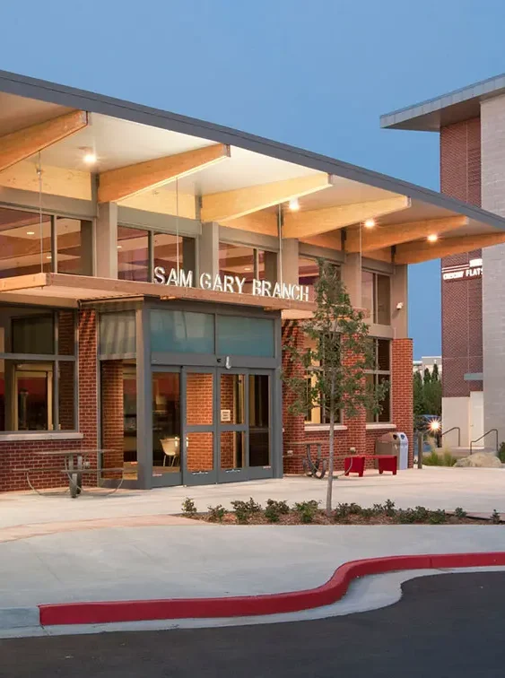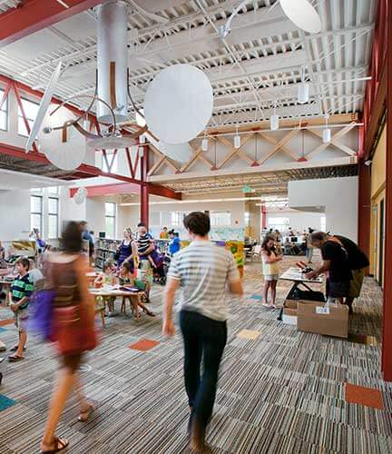 This 28,000-sf LEED Gold library incorporates a raised floor with underfloor air distribution, materials high in recycled content and passive solar. Evolving from numerous public meetings, the library meets a wide range of community interests in both traditional and flexible use areas by blending modern information technology amenities with neighborhood characteristics to activate a corner site in a dynamic urban infill redevelopment. Taking cues from an eclectic mix of surrounding architecture including retail, residential and business environments, the library presents a facade composed of varied elevations, abundant transparency and a diverse palate of traditional building materials – brick, stone, wood and metal.