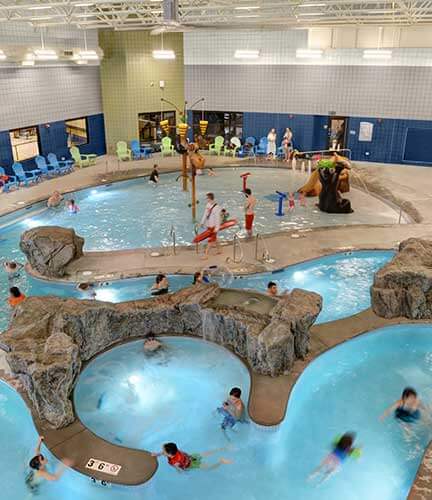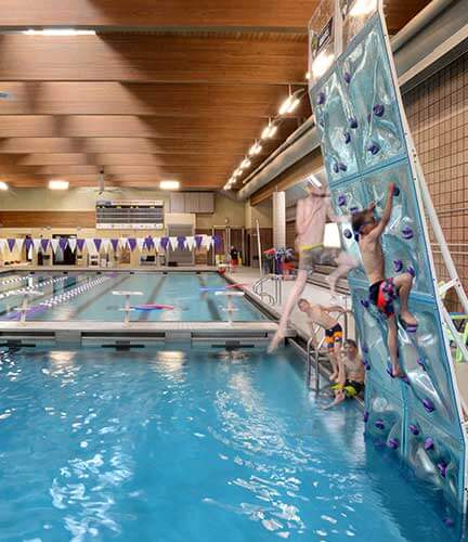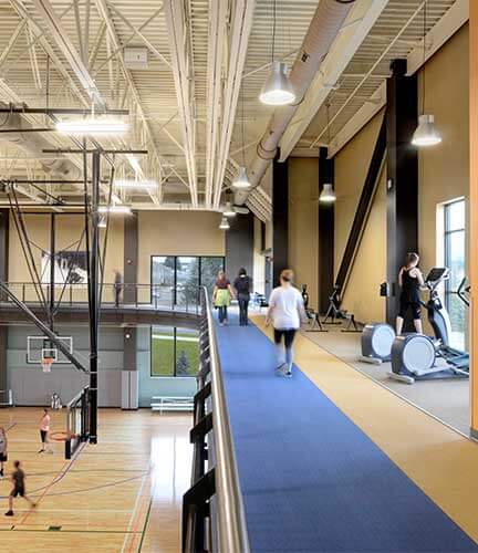 While renovations were underway, creating the new community center started. The 52,756-sf addition would combine community space needs – including senior services, library resources, family and youth amenities, meeting rooms and gathering spaces – along with family recreation and aquatics. French doors to the existing natatorium would open to the family natatorium, complete with water-play equipment, an outdoor jacuzzi, a lazy river and an outside-wrapping waterslide. Robust recreational spaces would include numerous group fitness rooms, exercise equipment areas, two gymnasiums, a suspended walking track and an indoor golf simulator.