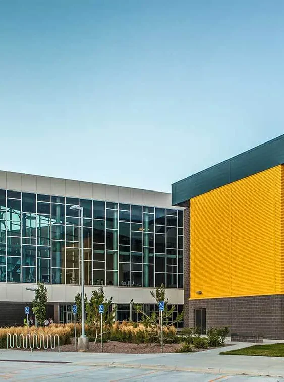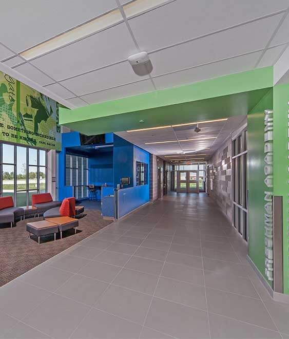 The impressive 384,000-sf school was built to accommodate 2,000+ students is located on a 121-acre lot and is segmented into four distinct academies, referred to as Small Communities of Learning (SCLs). Each SCL is represented by a different color: Public Service (blue), Arts and Communication (red), Trade and Health Science (yellow) and a Freshman Academy (green).