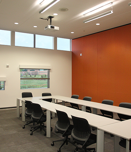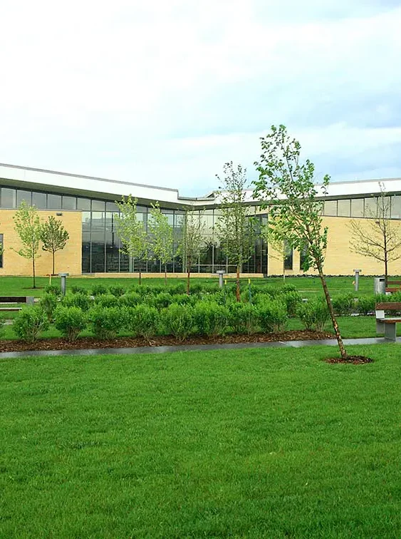 Designed for LEED®-NC compliance, the building features several environmentally friendly elements, which include green roof to reduce heating and cooling costs, geothermal (lake-based) heating and cooling systems, high clerestory windows along the roofline to maximize use of daylighting, low-maintenance landscaping with native plants and local building materials.