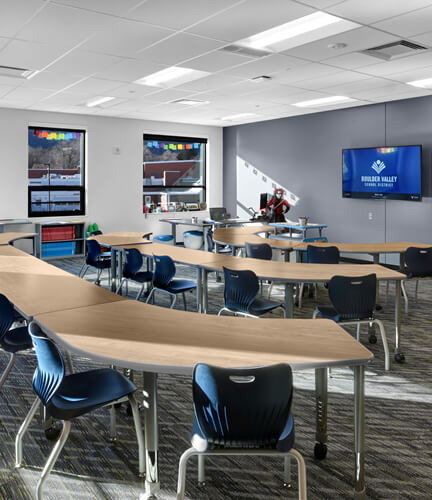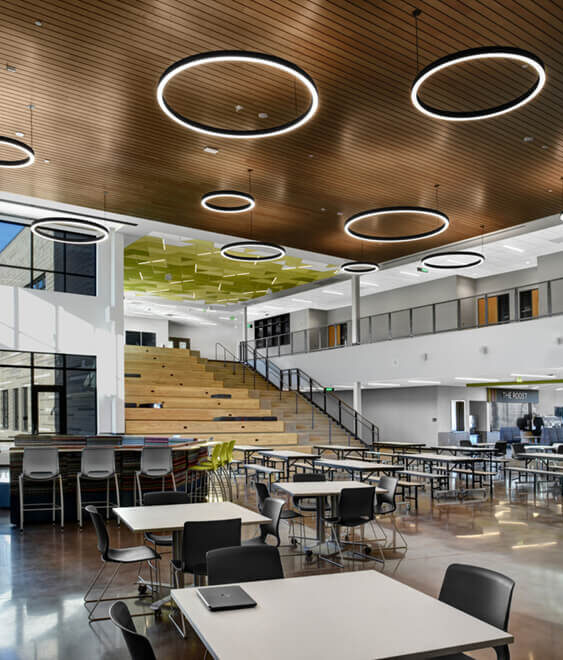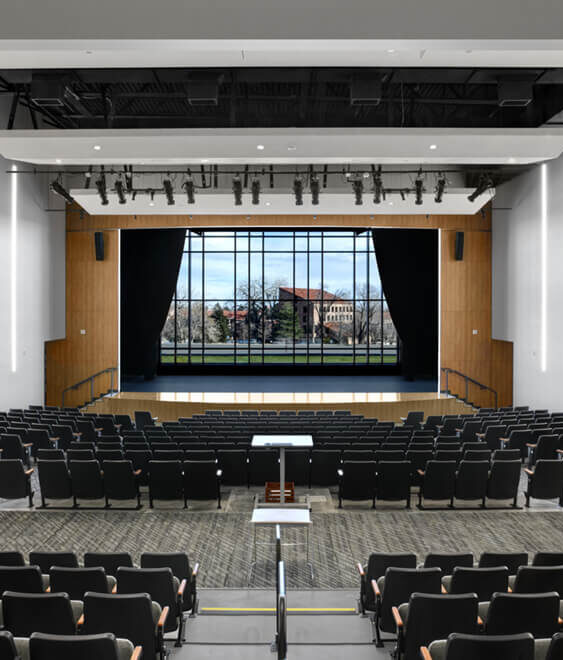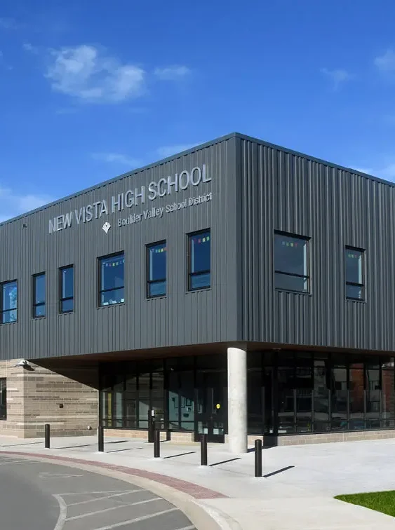 The replacement high school for Boulder Valley School District’s New Vista Theatrical School spans more than 74,000 sf. The project is a two-story building built on 767 drilled aggregate piers. Surrounded by a busy highway, the adjacent CU Boulder campus, and a bustling neighborhood, the project management plan required close coordination and strict adherence to quiet hours meaning zero building activities before 7 am. The project overcame several challenges on a campus where the occupied and existing building was just 10 feet away from the new structure’s building envelope. After building occupation, the district commenced demolition activities ahead of AP’s final scope of building new athletic fields.