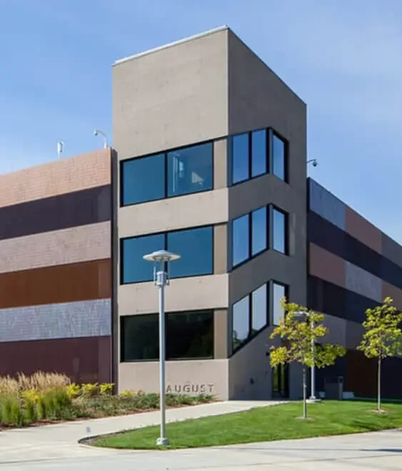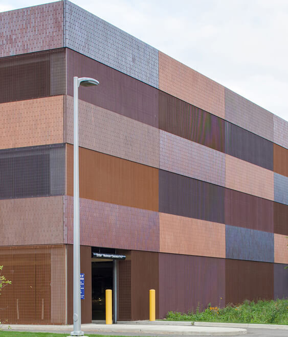The Normandale Community College Campus parking structure is centrally located with four levels and 725 total stalls. The following elements are incorporated into the finished product: the parking structure footprint is 56,000 sf with a total parking structure area (all levels) of 218,000 sf. The parking structure is cast-in-place post-tension concrete with a thin brick veneer precast on the exterior. Between the precast veneers is a metal screening to give the ramp an enclosed building look. Total volume of concrete utilized was approximately 8,000. The two stair towers are constructed with self-consolidating cast-in-place colored concrete utilizing a Thermomass insulation system. Thermomass is an insulated concrete sandwich; much like one would see in a typical insulated precast situation in this case, the sandwich was cast-in-place. The stair towers include structurally large sloping windows, making the concrete forming and placement unique.