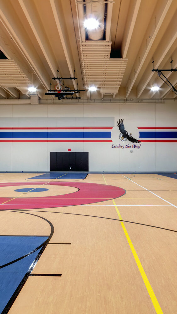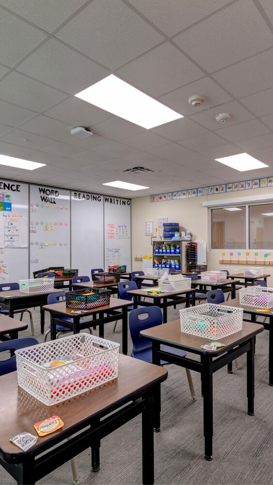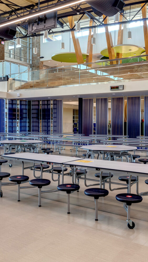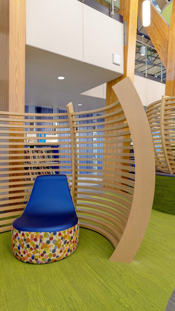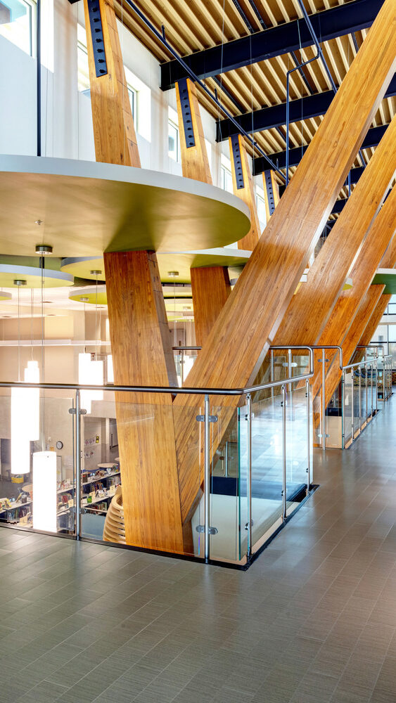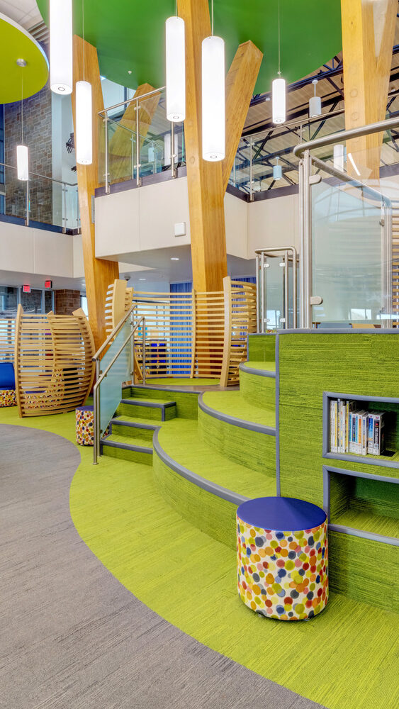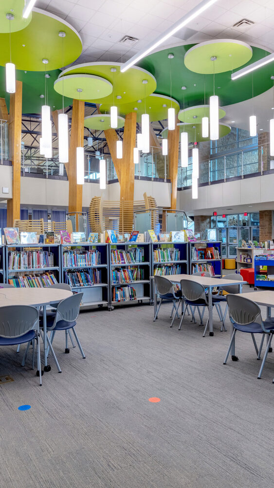 At the heart of the building is a learning commons and library designed to evoke a treehouse atmosphere, with classrooms and additional focus spaces surrounding the commons. Movable walls allow for flexible teaching and adaptable class sizes, while expansive curtain walls bring in abundant natural light throughout the school.