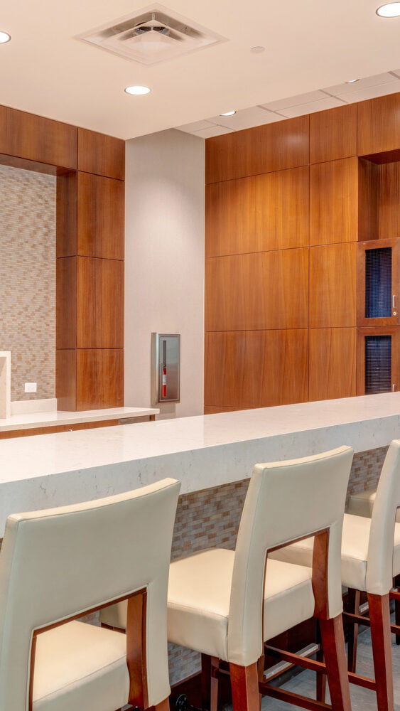 Improvements included a redesigned storefront entrance, upgraded concrete and site elements, and new landscaping featuring vertical transpiration and multi-colored stone pavers. Interior enhancements included high-end millwork within the café, elevating the overall tenant experience.