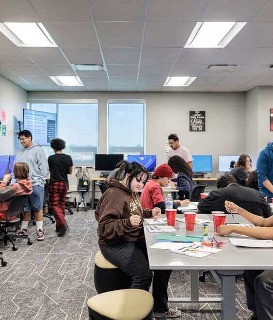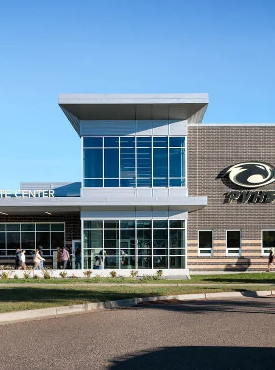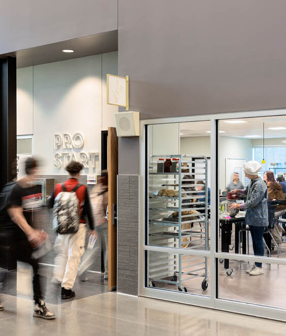 The building is organized around a central “main street” with visibility into the many different opportunities and class options. Wayfinding throughout the building and graphics for each pathway help identify each unique opportunity for students. The exterior design embraces materials of the existing high school while providing a new modern design, a showpiece and source of student and community pride.