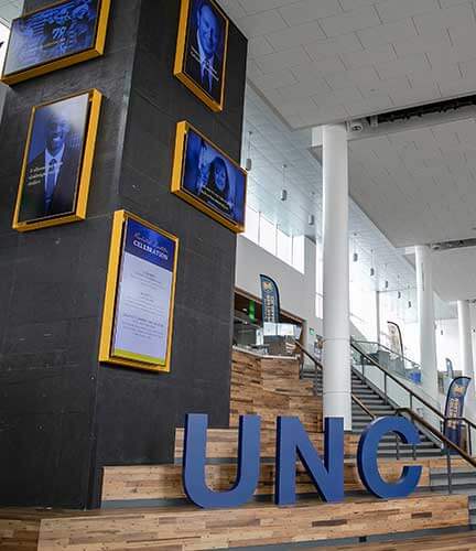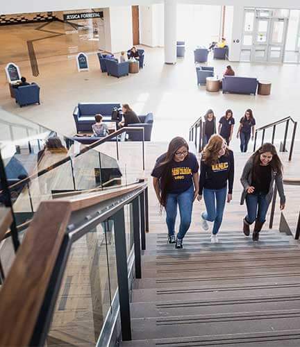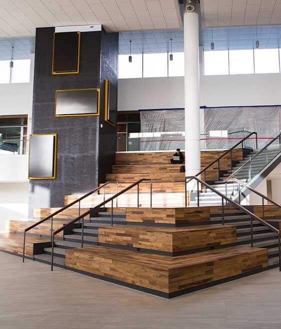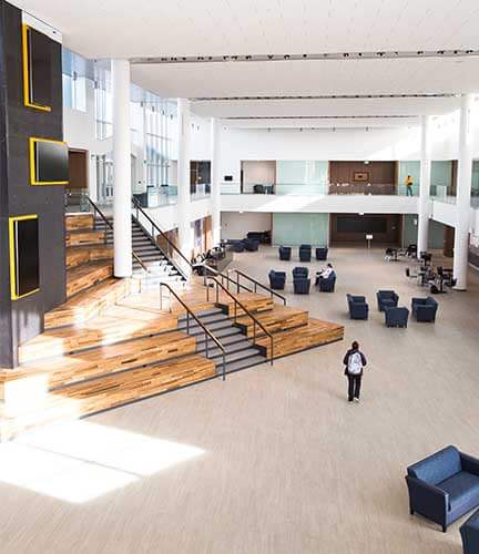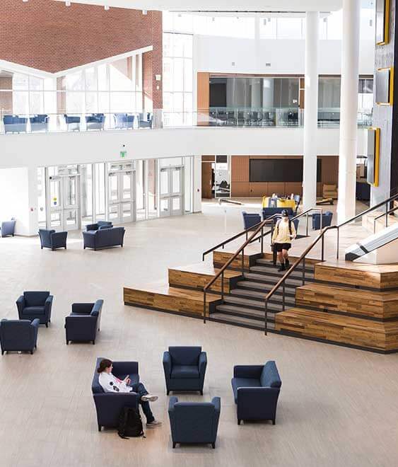 Campus Commons is an innovative campus navigation and support center for students, a new gateway facility to welcome visitors and a showcase for the University’s highly regarded music and theater programs. It brings together unique elements that support multiple departments and campus services. This included integrating 24,000 sf of office space and conference rooms; a 5,972 sf, 676-seat performance venue; a 400-seat multipurpose auditorium; rehearsal spaces; a light-filled, 14,523 sf open lobby; a 1,756 sf art gallery; and a student-run café supported by a full-catering kitchen.