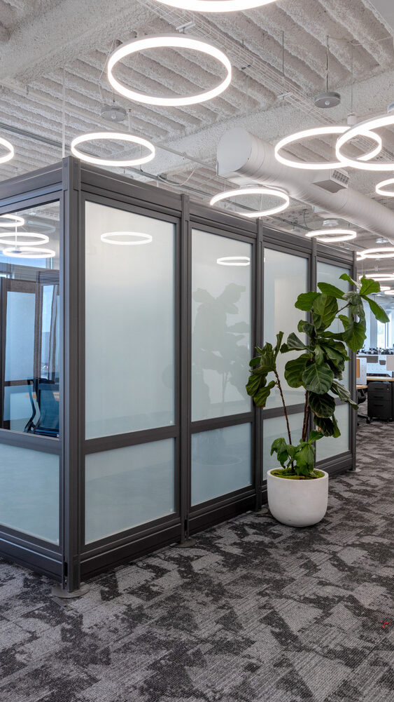The tilt-wall structure features large exterior balconies, an open-concept lobby with expansive staircases, and touch-free building applications. On-site amenities include a fitness facility and grab-and-go food services, enhancing the overall workplace experience.