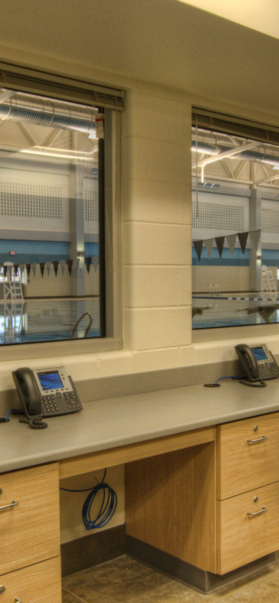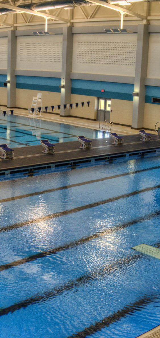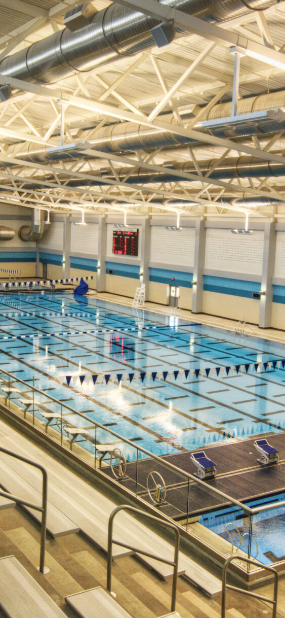 The 1,200-seat facility includes two pools: a 50-meter competition pool designed for swimming and diving events, and a secondary pool for warm-ups and community programming. Supporting amenities include locker rooms, a community classroom, and a weight room, creating a well-rounded environment for student-athletes and the broader community.