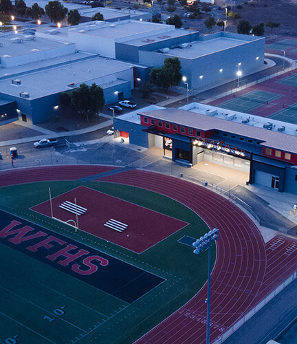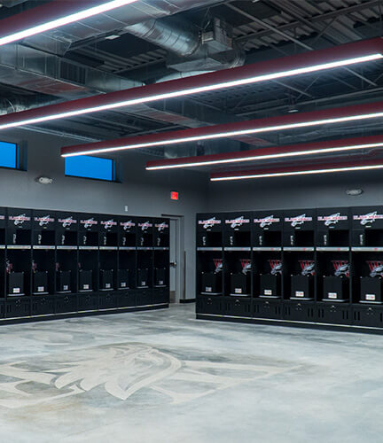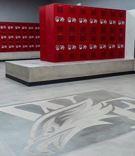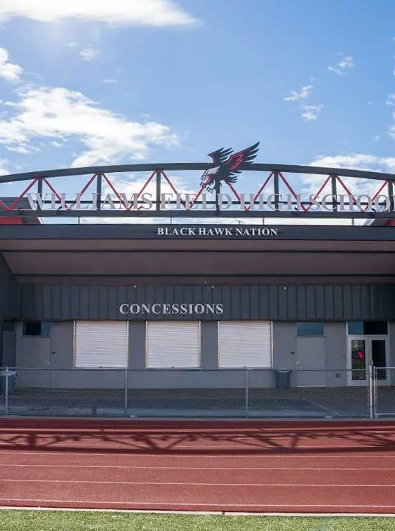 Williams Field High School Demolition/Field House project includes demolition of an old concession stand, landscaping and a new building. The new 14,500 sf facility, built to enhance the school’s sports program, consists of a glass faced trophy case as a focal point of the building. Amenities include three dedicated locker rooms with custom built lockers, a concession stand complete with stainless steel counters and equipment, and a spacious meeting room with retractable bleachers. The building also has office spaces for the coaching staff and seven restrooms. Outside the CMU block building, steel roofing and a large bow truss with decorative steel joists highlight the facility’s strength.